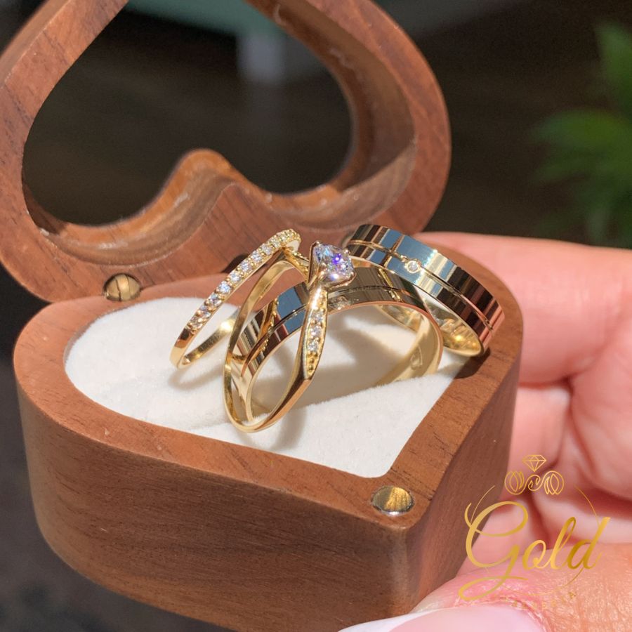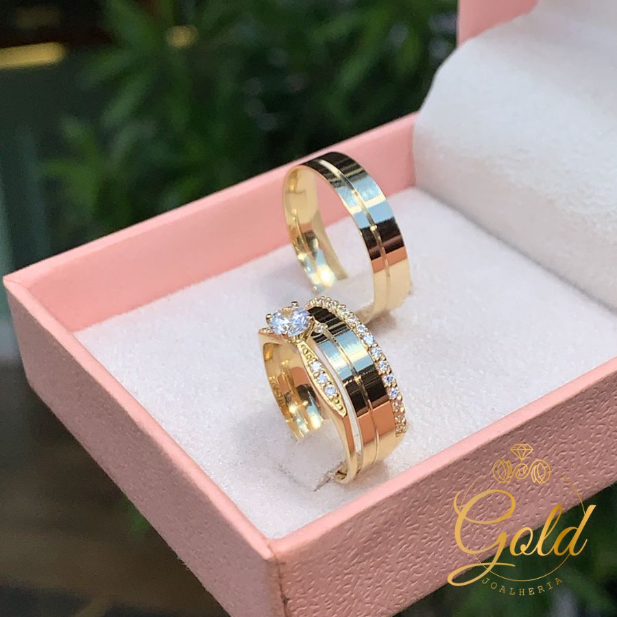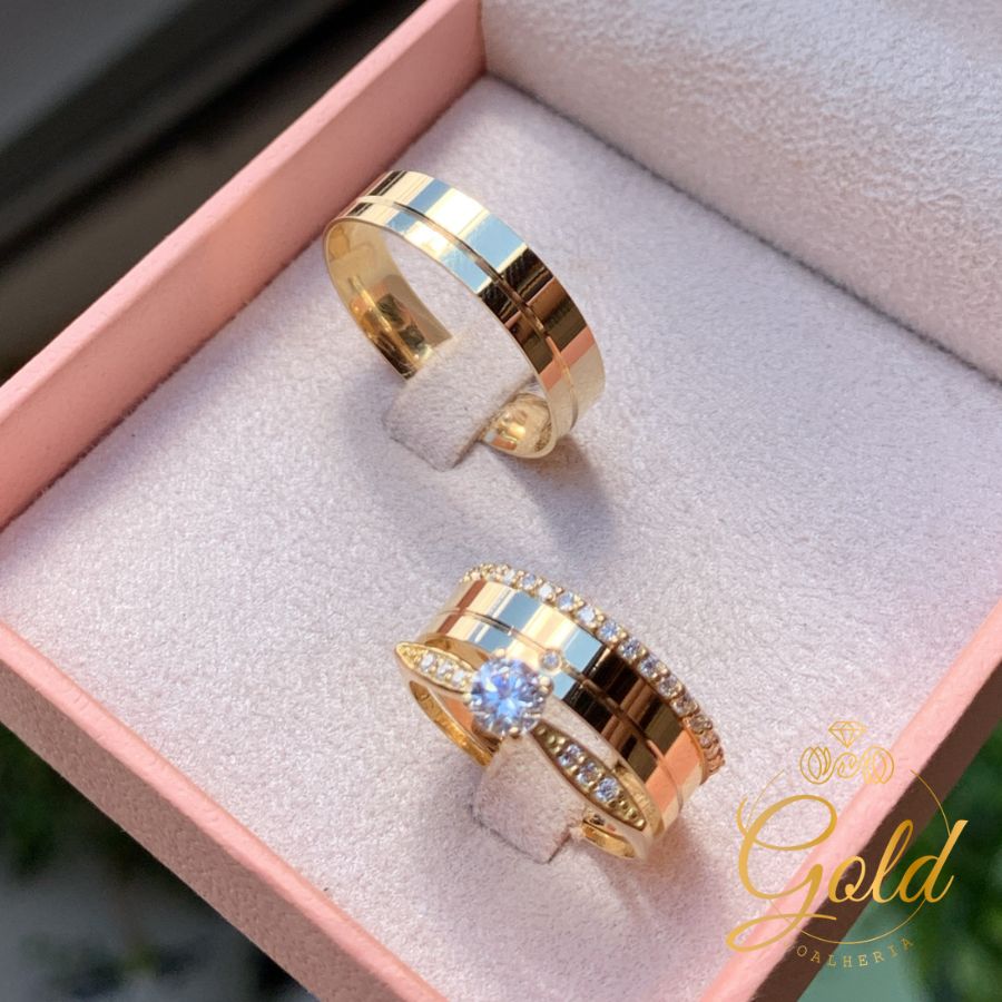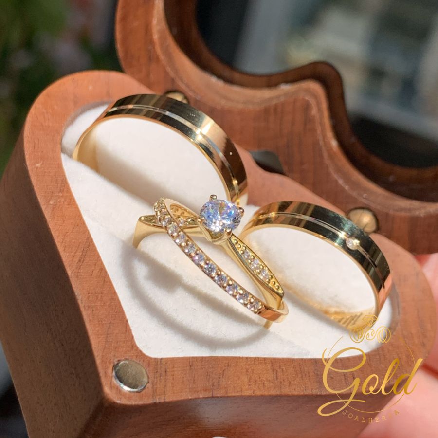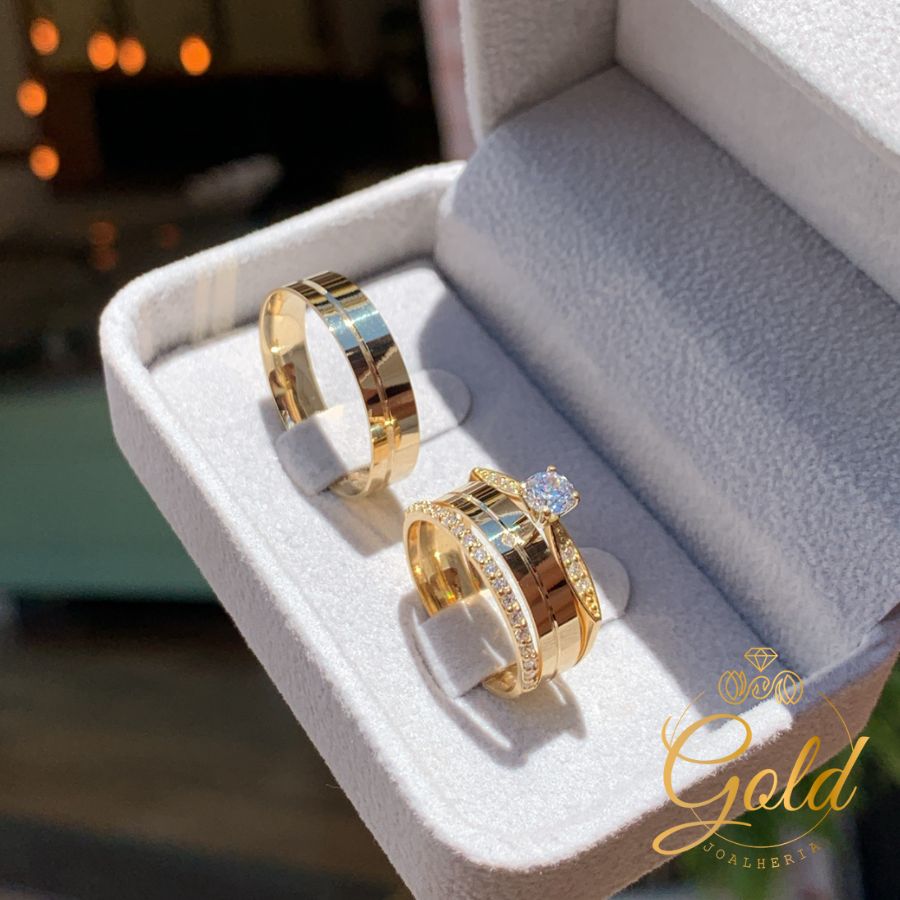 Conjunto de Alianças Berlim 4,5mm + Anel Solitário Santorini + Aparador Meia Volta de Pedras em Ouro 18k/750