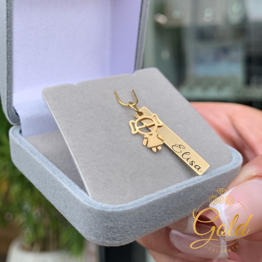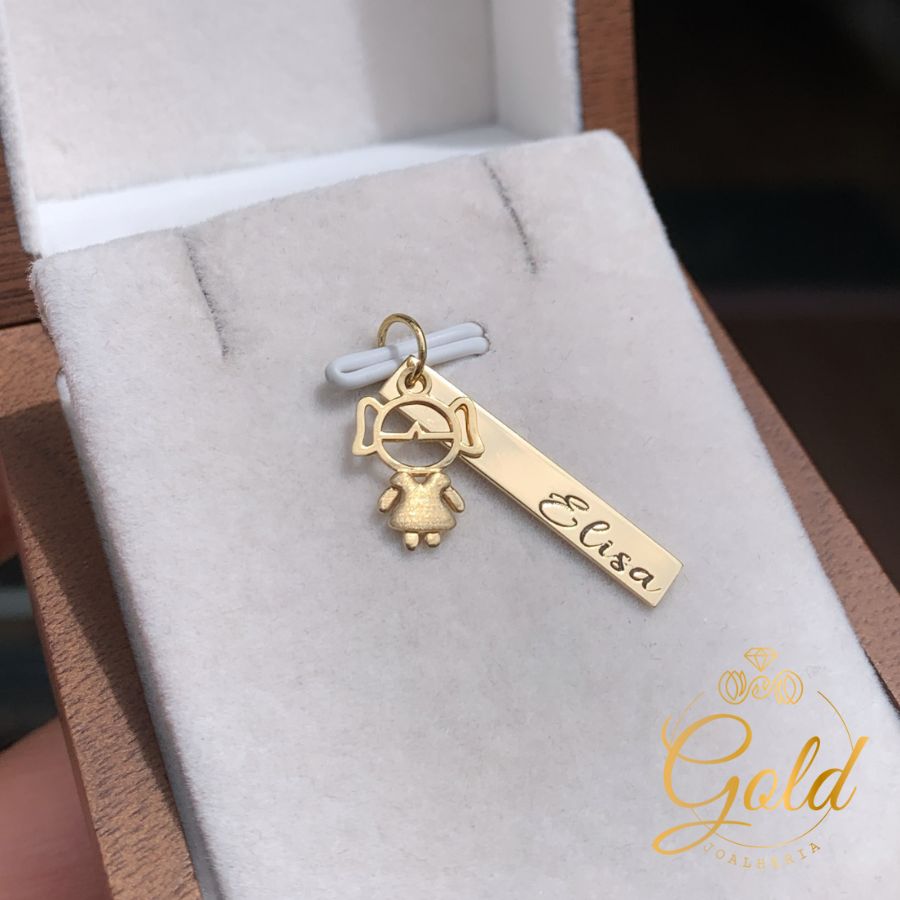 Pingente Plaquinha com Pingente Menina em Ouro 18k/750