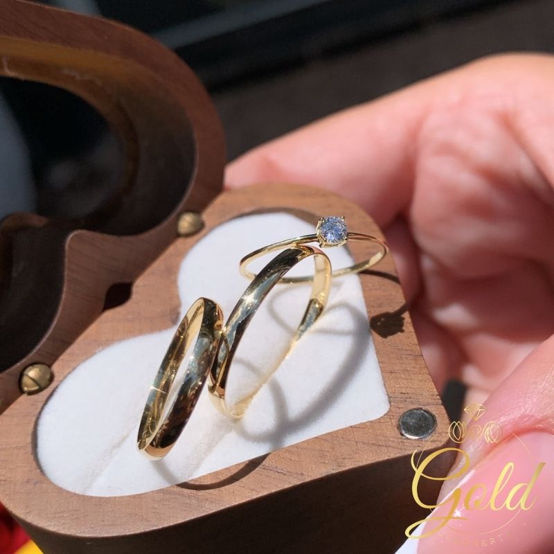Início TODA A LOJA Trio de Alianças Abaulada 2,5mm + Anel Solitário Doce Luz em Ouro 18k/750