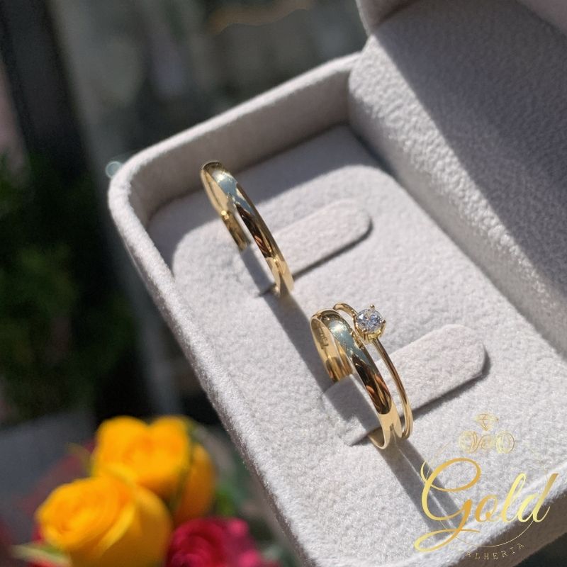 Conjunto de Alianças Abaulada 4,5mm+ Anel Solitario Athenas + Aparador Volta Toda de Pedras Em Ouro 18k/750