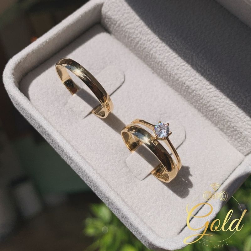 Trio de Alianças Paris 5,5mm + Anel Solitário Realeza em Ouro 18k/750