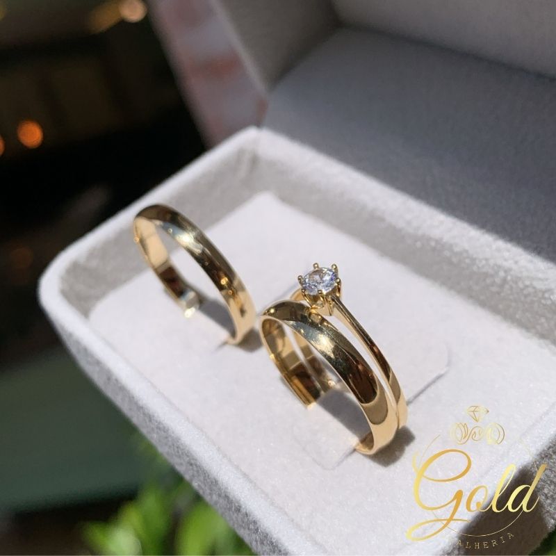 Trio de Alianças Abaulada Alta 3,5mm + Anel Solitário Imperatriz em Ouro 18k/750