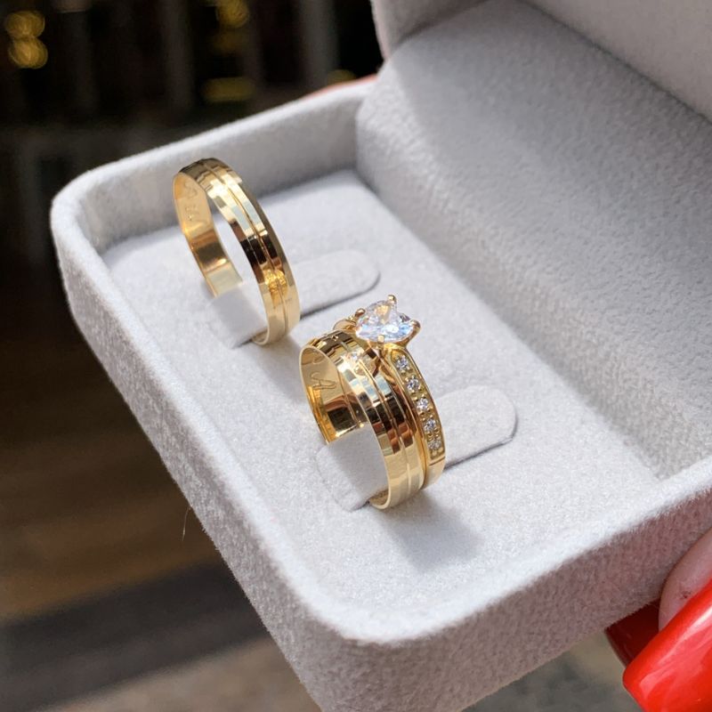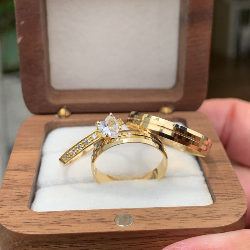 Trio de Alianças Romeu e Julieta 3,5mm + Anel Solitário Coração do Oceano em Ouro 18k/750