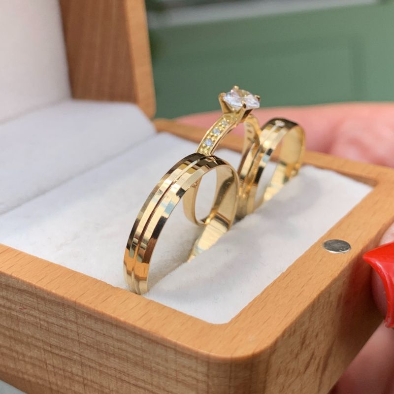 Trio Alianças Paris 3mm + Anel Solitário Lírio em Ouro 18K/750