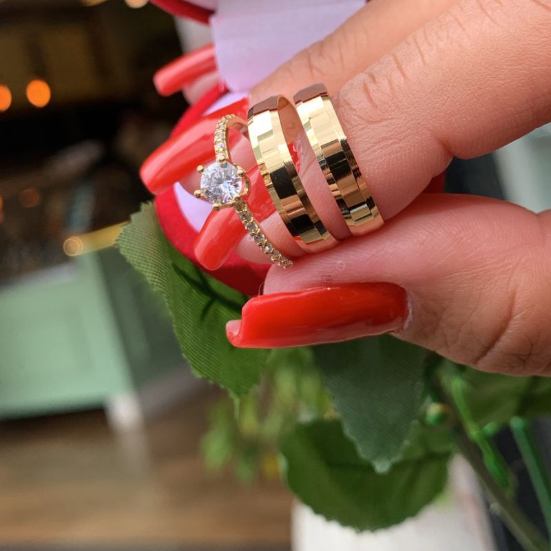 Trio de Alianças Infinity 4mm + Anel Solitário Realeza em Ouro 18k/750