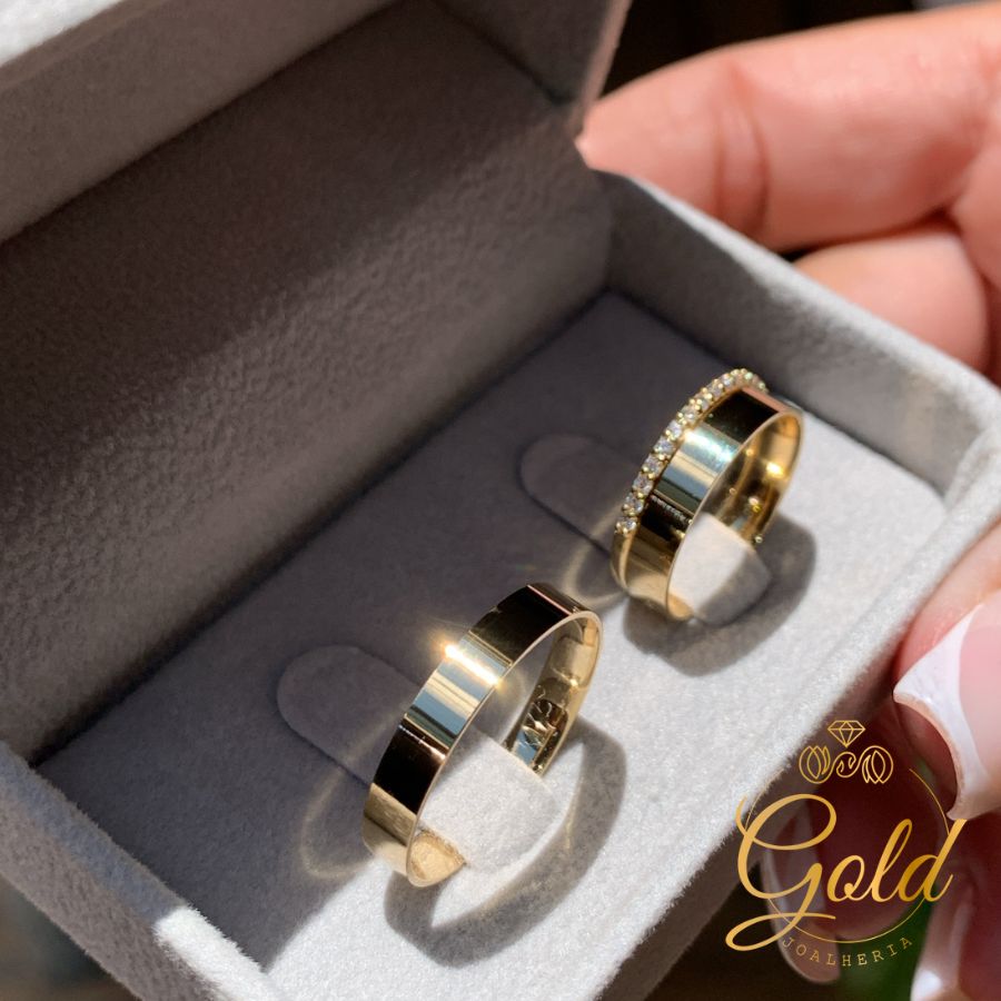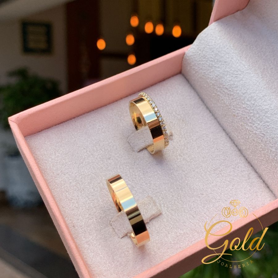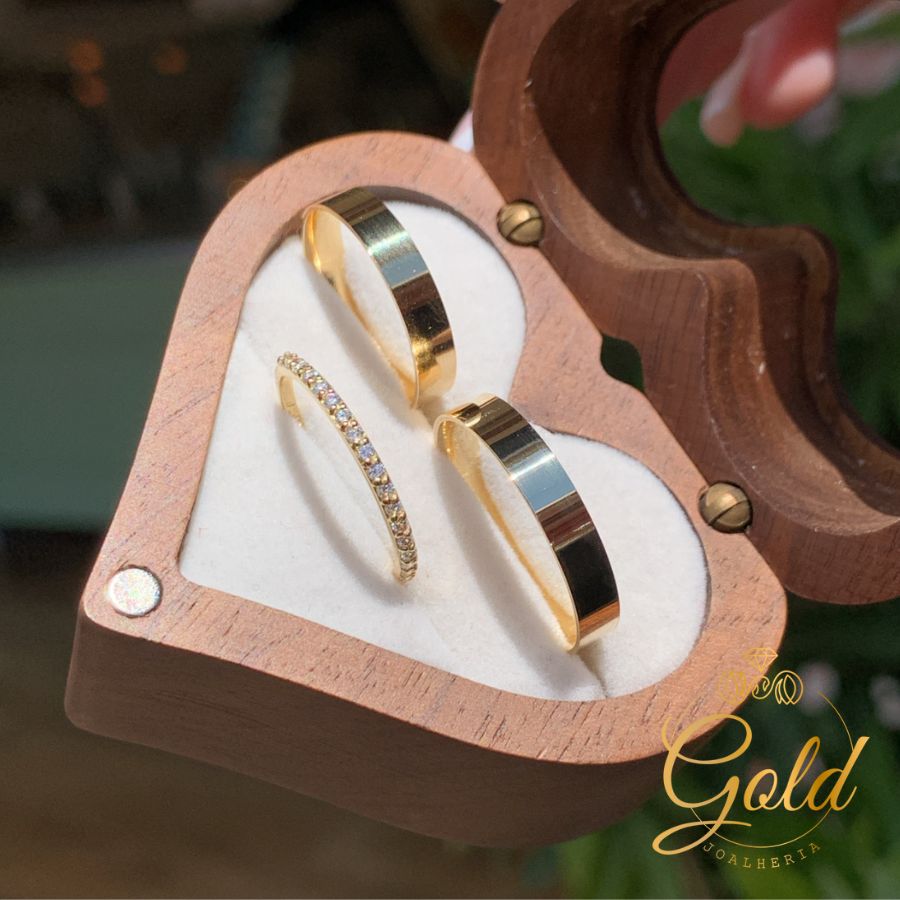 Conjunto de Alianças Berlim 4,5mm + Anel Solitário Santorini + Aparador Meia Volta de Pedras em Ouro 18k/750